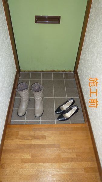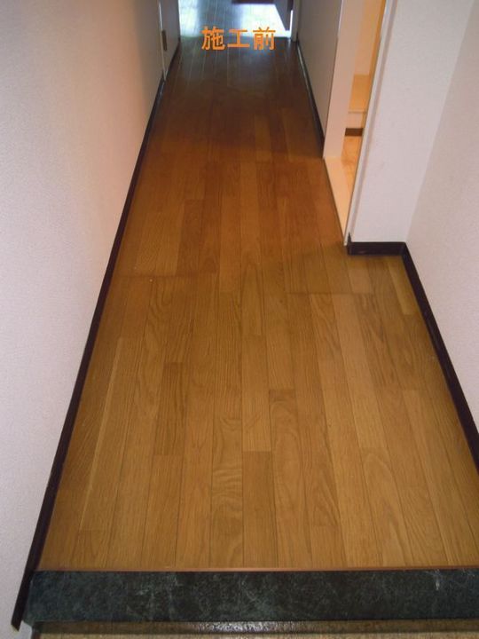 玄関部分は、フローリングとクロスの貼り替えのほかに、玄関框と、巾木の交換も行いました。