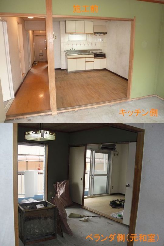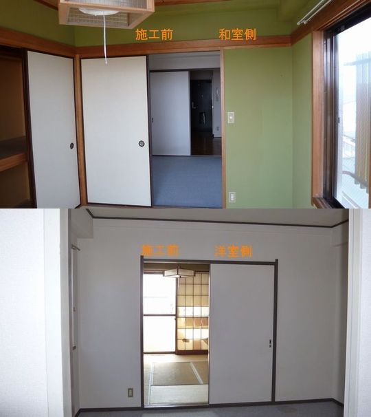 施工前と施工後の写真はそれぞれ別のお部屋のものですが、左右が反転しているだけでお部屋の構造が同じで、3部屋とも同じようにお部屋を統合しています。